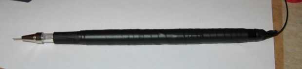Luego, con alguna cinta eléctrica, cinta de la batería para el lápiz, luego suelde el cable de 60cm en el otro extremo de la batería y cinta ello batería al otro extremo de la pluma, cuando el hilo ha sido alimentado a través del extremo de la pluma.