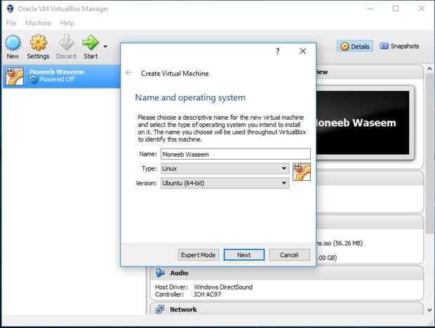 Presione el botón "Nuevo" para crear una nueva máquina Virtual. Esto aparecerá una ventana que le permitirá dar un nombre a la máquina Virtual y seleccionar qué tipo de sistema operativo se ejecutará la máquina Virtual. En este caso seleccionará prensa y Linux y Ubuntu 64 bits "Siguiente".