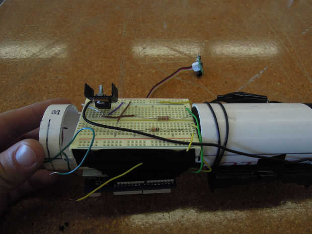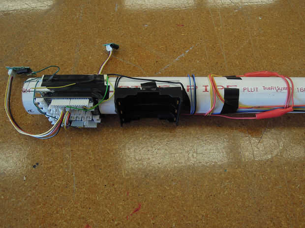 La batería, protoboard y Arduino (con escudo de Base de Grove) pueden todo sujetarse a la "columna vertebral" cortando hacia fuera de las cavidades en el PVC. Posición de estas aberturas en la "columna vertebral" como cerca de la parte superior del PVC dejando todavía una porción completa del PVC de la pipa en la parte superior (para integridad estructural).