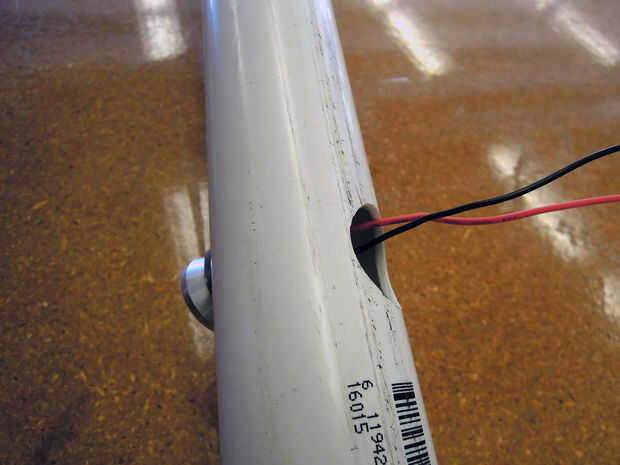 Una vez las tres luces (y collares) se colocan en la "columna vertebral" correr los cables por los agujeros en el otro lado de la columna vertebral y uso cinta aislante para asegurar los cables a lo largo de la longitud de la "columna vertebral".