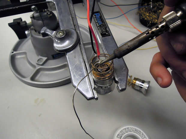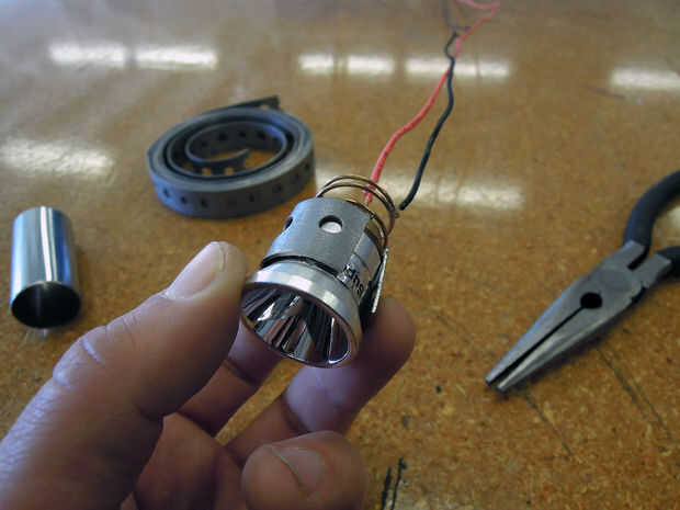 Soldar los cables a la bombilla. La bobina interior (+) y la bobina exterior (-).