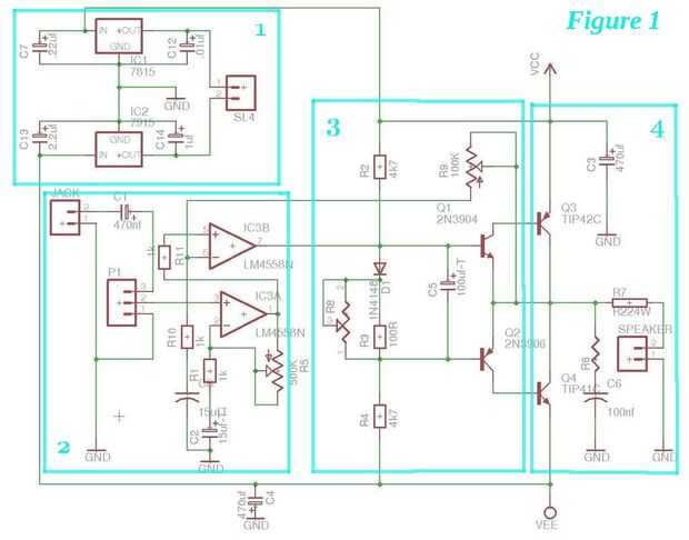 En la figura 1 aquí me han llamado 4 bloques azules alrededor de los circuitos que componen el circuito entero. Bloque 1 es la fuente de alimentación. Puede ser construido primero y probado. Ser una fuente de alimentación doble cada lado del mismo se hizo y probado por separado. Bloque 2 es la sección del preamplificador. Dos etapas, cada etapa puede ser construido y probado en orden, IC3A entonces IC3B. Las secciones 3 y 4 son etapas de amplificación de potencia. Para probar la etapa 3 por sí mismo algunos ajustes circuito temporal deba hacerse, pero las señales se pueden probar en ese momento.
