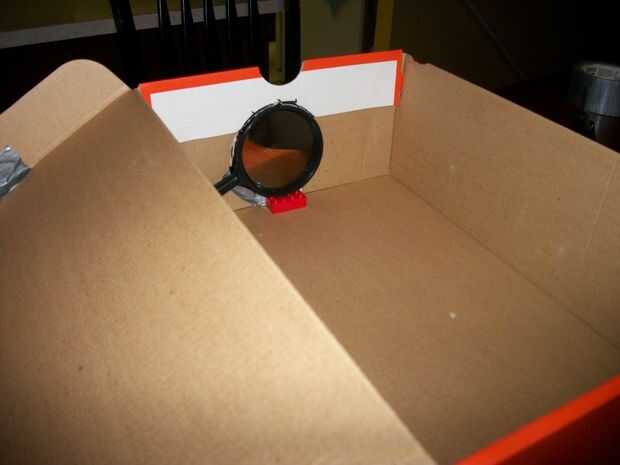 Estamos usando una lupa como lente cualquier tamaño trabajará para ello. Empiece por encontrar el centro de la caja y marca. A continuación poner la lupa en la caja y cuidadosamente traza alrededor de él con su marcador. Después de tener un círculo dibujado limpiamente sacar su cuchillo. La mejor clase de cuchillo para esto sería un cuchillo X-acto pero ya que no tengo un sólo usé un cuchillo afilado con una punta muy afilada. Cualquier cuchillo hará pero uno con una punta muy afilada es ideal. Poco a poco cortar el círculo que marcó en la caja tenga cuidado para que los bordes se cortan limpiamente para mejores resultados. Después de cortar el círculo corte algunos agujeros en la parte posterior para altavoces y un cable de carga para que usted no se quede sin baterías durante el uso de su proyector. Encubrió los bordes ásperos en mi agujero lente con cinta adhesiva y gran trabajo. Ahora Alinee la lupa y empuje en el agujero y pégalo en. Puse la lente a la mía un poco encima de la caja y utiliza un Lego para sostenerlo para arriba mientras que estaba pegado por lo que sería estable. Si la lupa tiene una manija de cinta adhesiva en el interior de la caja con la cinta adhesiva.