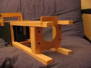 Añadir piezas cortas de bateo a la lente el sándwich y cortan muescas para que quepan entre los cuatro trozos de listón que sobresalen de la cubierta principal. La unidad de lente debe deslizarse hacia adelante y hacia atrás, pero se mantiene en su lugar por alguna fricción. Este es el mecanismo de enfoque sofisticado!