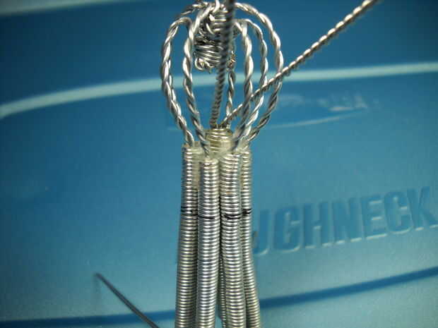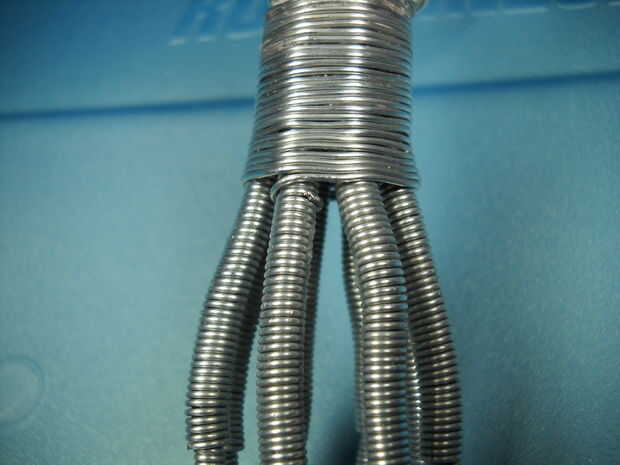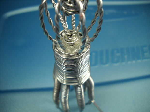 Si observas en las fotos, envuelve la cabeza unas cuantas veces antes de envolver el cuerpo, porque no estaba segura de cómo iba a manejar esa posición. Resulta que, es una mejor idea hacer lo que describo aquí (en vez de cómo lo hice), que es un poco diferente a las fotos que tomé mientras trabajo, pero que es por eso. Creo que quedará claro en las fotos para que pueda elegir cómo quiere proceder. Sugeriría que comenzar envolviendo firmemente alrededor de una de los parte inferior cabeza cables, justo al lado de la parte superior de los tentáculos, con el cable de 20g. Sólo un abrigo apretado alrededor entonces continuar envoltura alrededor de la cabeza de una vez, entonces usted querrá envolver hacia abajo el cuerpo de 1/2" o 12mm de la parte superior de los tentáculos. En este punto empezaremos la piel estirada entre los tentáculos. Esto se hará lo mismo que todo lo demás, simplemente envolver alrededor de los tentáculos. La diferencia con esta parte es que los tentáculos del ángulo hacia afuera un poco desde este punto, por lo que debe tener cuidado para no deformarlos mucho. Meter un dedo en el medio para suministrar presión de contador. La otra diferencia es que el embalaje debe formar de forma de octágono, en lugar de un círculo a partir de aquí. Como la piel se estira entre los tentáculos y por lo que se estira a través del área entre, usted querrá simplemente tire del cable un poco más mientras usted de tentáculo en tentáculo. Continúe envolviendo hasta llegar a ¾" o 19mm. Aquí usted puede cortar unos ½" o 12mm o más allá de uno de los tentáculos de la parte inferior, luego abrigo extra que bit todo el tentáculo para fijar los cables en su lugar. Mantenga los cables firmemente con los dedos y cortar y envolver para no desenrolla todo.