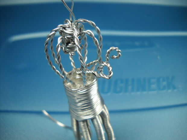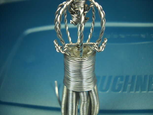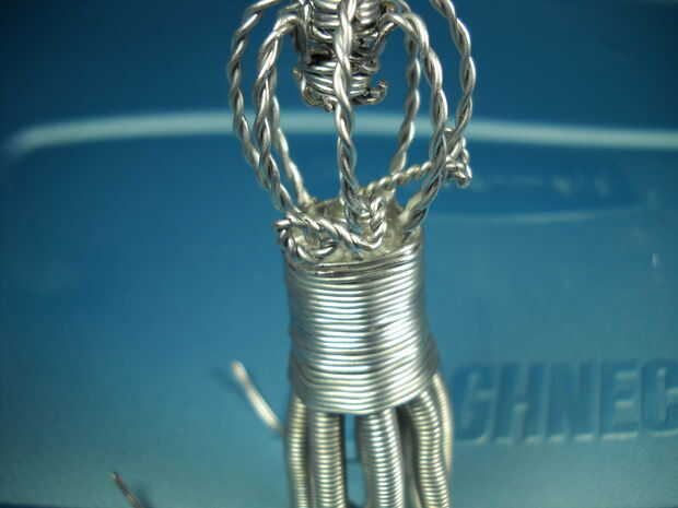 Como ves en las fotos, he formado los ojos medio raros, lado a lado (así son) y luego les volcó en su posición. Es simplemente más fácil conseguir cosas simétricas de esa manera pero usted puede doblar ambos individualmente si lo prefiere. De todos modos, doblado los hilos en ángulo recto, seguido por un semicírculo bastante pequeño (que va a convertirse en la frente) y que envuelve los cables alrededor de un lápiz en la dirección opuesta en un círculo completo (que el zócalo del ojo). Por último sólo recorta el alambre extra donde se reunió con el frente y doblar esa parte del cable detrás de la frente, en el cráneo, la frente es prominente (empuja hacia delante).