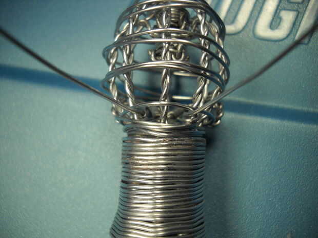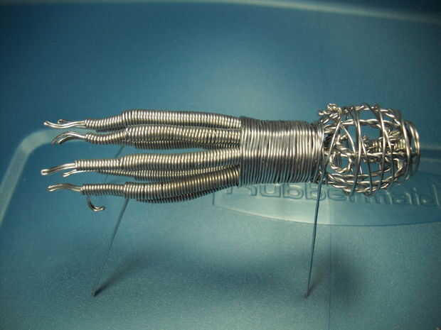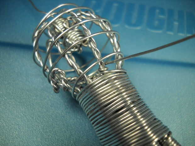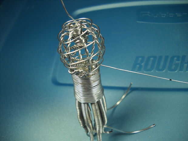 So now we’re near the end. Tomar uno de los cables colgando de la parte superior de la cabeza, empezar a envolver alrededor de la cabeza en pequeños círculos, ensanchando a medida que avanza y luego mover abajo de la cabeza al cuerpo en aproximadamente igual a las secciones (o caóticos y al azar intervalos, lo que flota su barco). Tenga en cuenta que necesidad de 5"/ 12cm de las algas que usaremos para conectar el cuerpo, la cabeza a la base. Así que ajustar en consecuencia, el número de vueltas si no hay suficiente cable izquierda. Al llegar a la envoltura alrededor de ese "guión" o "brecha" entre los tentáculos y donde ellos salen los cables de la cabeza, ese tipo de "cornisa" necesita rellenarse. No todo el camino, hay otro cable que bajaba después de éste, así que solo envuelve un par de veces para empezar a llenar. Luego Envuelva el cable alrededor de uno de los cables de la cabeza en la parte de atrás, bien. Mida y marque 2"/ 5cm de la cabeza. Firmemente la curva hacia arriba hacia la cabeza, seguir envolver que cabeza alambre una o dos. Cortar y apretar el alambre.
