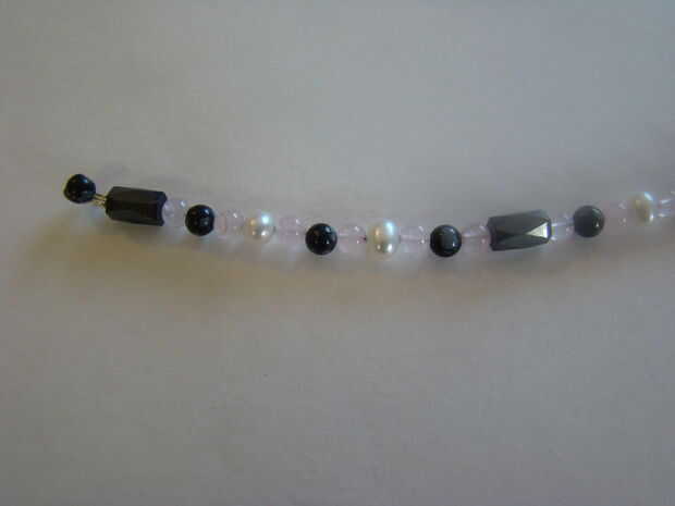 Decidir el patrón que desee para el espacio entre los granos de hematita. Hacer el patrón, cuarzo rosa, obsidiana negra, RQ, perla, RQ, BO, RQ, perla, RQ, BO, RQ. Si desea, puede poner 9-11 perlas del mismo tipo.