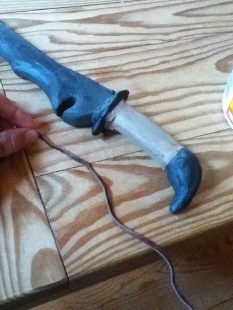 Utilice pegamento caliente para poner pequeños toques en las partes de la travesía y en el extremo de la manija donde tienes la insignia. Pintar el gris de la cola y las líneas que la parte de atrás negro, puede a tiempo usando el mismo método que antes.