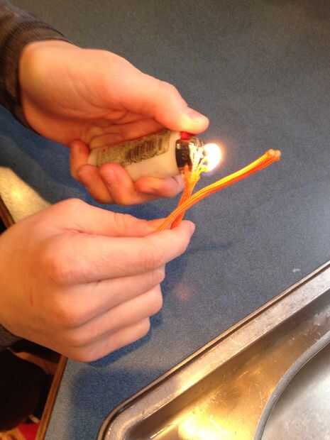 Corte el extremo más grande de cuerda para que sea aproximadamente el mismo tamaño. La luz de los extremos así que cambia de forma. Fusionarlos juntos así que cambia a las mismas formas juntos. PRECAUCIÓN PUEDE ESTAR MUY CALIENTE. No soy responsable de cualquier lesión.