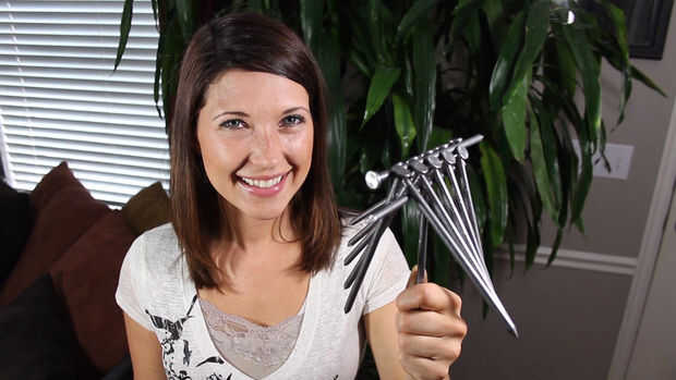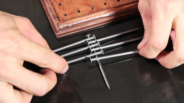 Ahora puede tomar el clavo en la parte inferior y levante lentamente hacia arriba hasta que cuelgue las otras uñas, atar sus cabezas encima de superposición de clavo.