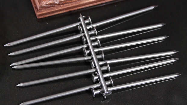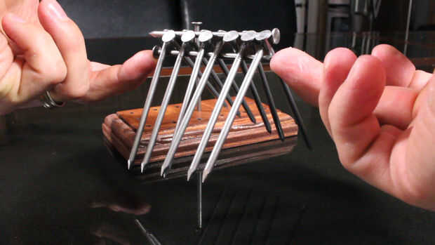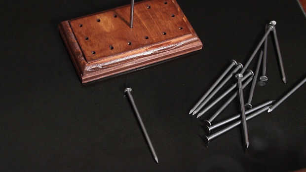 Comenzar colocando un clavo sobre la mesa, luego escalonar los otros clavos en la parte superior, por lo que alternan las direcciones, como se ve en las fotos, y que hay suficiente espacio entre las cabezas de la oposición que puede establecerse el último clavo en la parte superior. Este último clavo enfrenta a la dirección opuesta a la primera que se puso sobre la mesa.