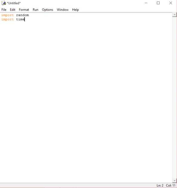 Entonces lo que estamos haciendo es pidiendo a python para llevar algunas cosas en. Usted probablemente puede adivinar que importar al azar nos ayudará a diseñar la parte donde se elige un número aleatorio. El tiempo es sólo una vez que termines el juego, se cerrará después de cierto tiempo. Buen trabajo hasta ahora!