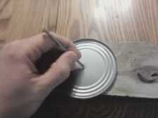 Tome el martillo y clavo y un martillo el extremo de la uña en el centro de la lata de atún.