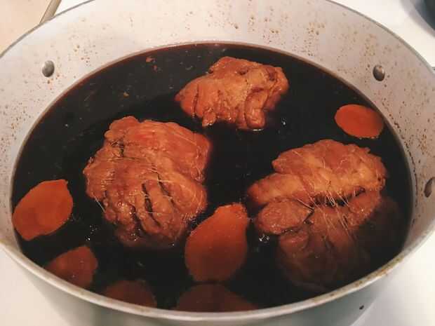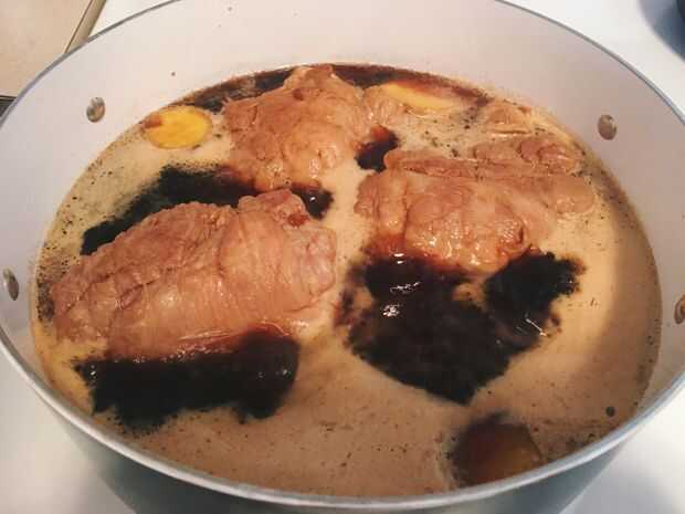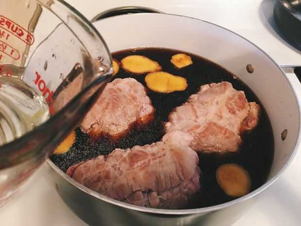8. Coloque la carne de cerdo, jengibre y la salsa que hemos utilizado para macerar los huevos en una olla grande. Puede añadir algo de agua si la salsa no es suficiente.