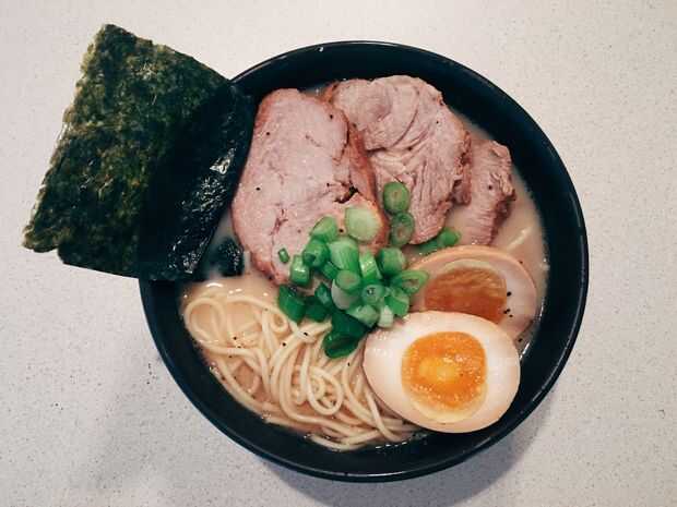 Dirigido por Keizo Shimamoto y vendido en Smorgasburg Brooklyn, Nueva York, el Ramen Burger, una empanada de glaseado en salsa de soja ubicado entre dos bollos de eggy ramen. Ramen instantáneo se convierte en un bollo de hamburguesa casi instantánea