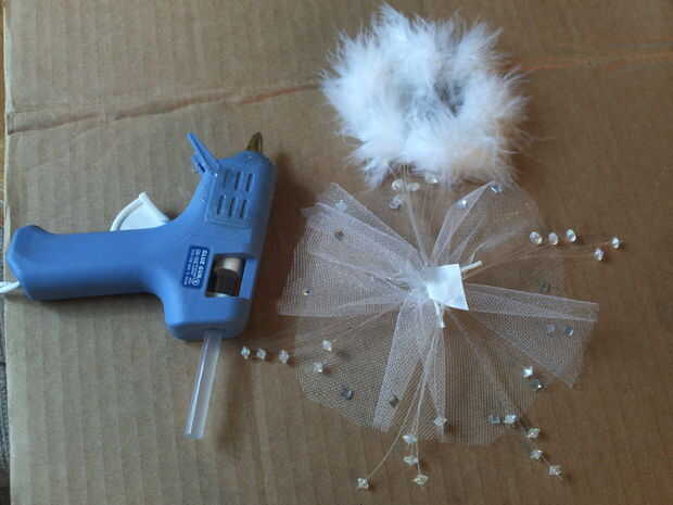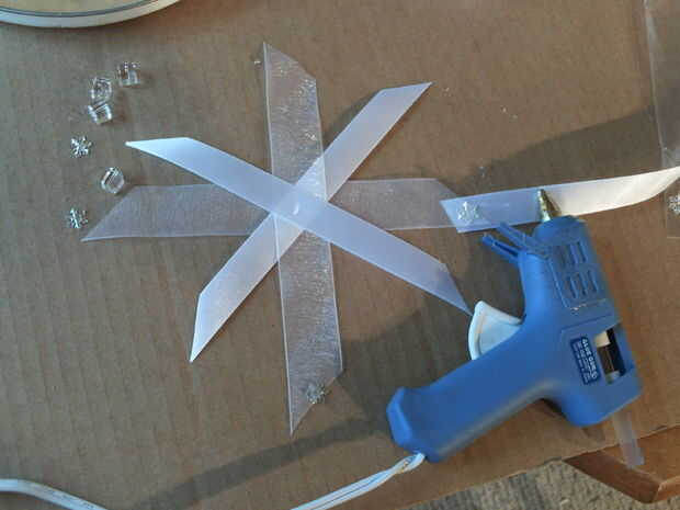 En la parte superior de las secciones inferiores, opté por hacer un círculo de cinta pluma. Caliente con pegamento sobre el material de la malla, teniendo cuidado de no quemarse los dedos, o pegarse a la superficie de trabajo. Use algunos pedazos de desecho de cinta saciar para empujar el círculo sobre el pegamento.