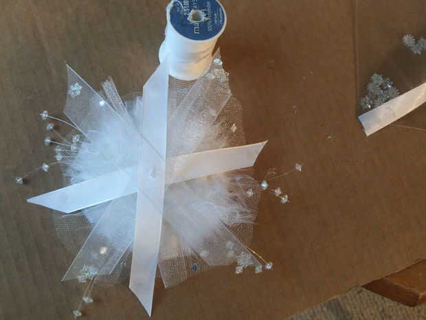 Corte 2 piezas de Satén y pura cinta. Cortar los extremos en un ángulo. Cruzar las cintas, por lo que cada extremo se alterna con una textura diferente. Tack(SEW) el medio y añadir adornos.