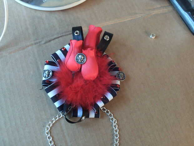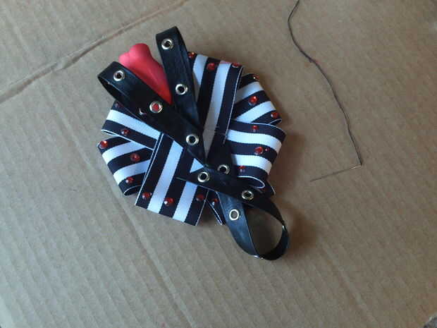 Pegamento caliente el círculo al centro de la base, cubriendo los lazos de cuero. Tenga cuidado con los dedos. Utilicé un trozo de cinta de raso para empujar la cinta de plumas en la cola.