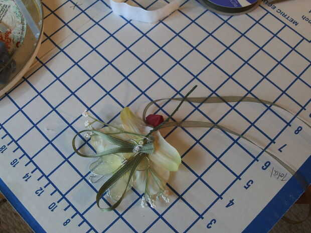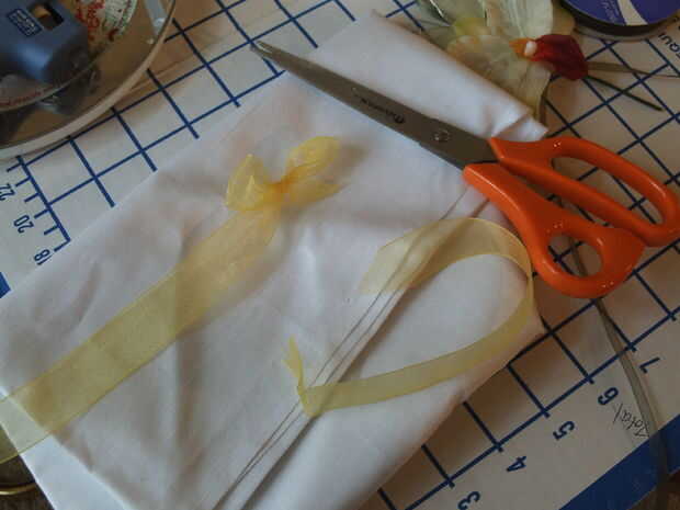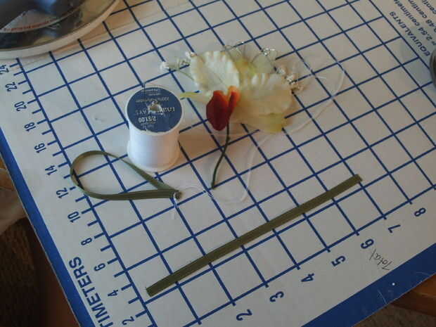 Utilice 15" pedazo de cinta pura, medio ancho, amarillo para hacer el arco para el vástago. La pura le permite moverse como apretar y no muestra errores. Una vez que la cinta es segura, cortar los extremos y con un poquito de pegamento caliente de la tachuela.