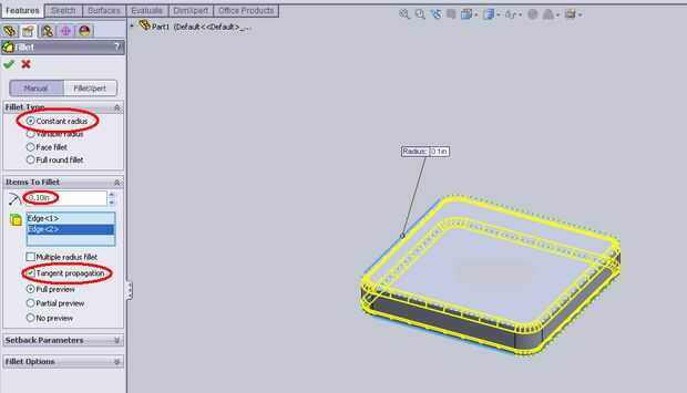 Seleccione "Filete" y establezca el "tipo de filete" a radio constante. Dejar el radio en 0.0 y seleccione "< 1 >" y "Borde < 2 >" en el área gráfica. Haga clic en Aceptar.