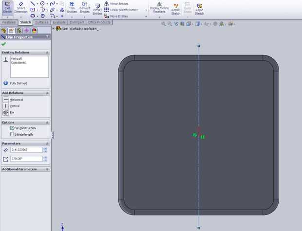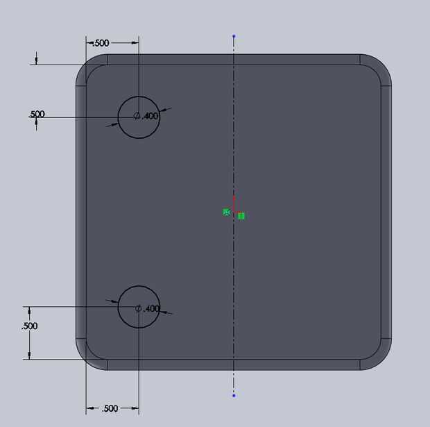 Caja en la orientación de la vista, seleccione inferior. Esboce una línea central, y luego un círculo en la esquina superior izquierda. Dimensión inteligente el radio a 0,400. Con dimensiones inteligentes aún seleccionada, coloque el círculo para ser 0.500in.away de los bordes superiores e izquierdos.