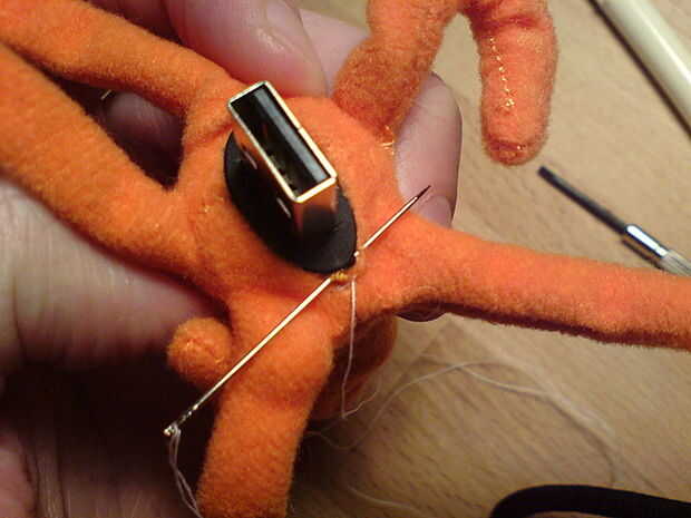 Cuando se sujeta el corte, puede empezar a coser la capa de goma a la tela de la muñeca. No tienes que coser alrededor de la abertura entera, solo coser los extremos de la unidad va a hacer bien, como en la foto.