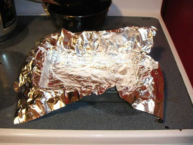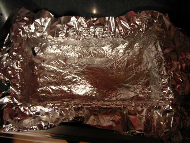 Por este tiempo la cera debe se hayan enfriado mucho, pero asegúrese de que usted prueba primero. Si está demasiado caliente al tacto, fresco más, usted podrá para moldearla. Cubrir la bandeja con el papel de aluminio y comenzar a presionar hacia abajo como en la primera imagen a continuación. Asegúrese de obtener las esquinas. Una vez que sientes que tienes buena bastante (no tiene que ser perfecto, después de todo solo vas a quemarlo), que usted puede dejarlo secar durante la noche o usted puede lanzar en el congelador por una hora. Puedes ver cómo lejos abajo mío entró en cuadros 2 y 3.