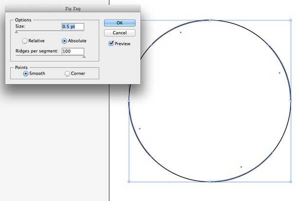 Básicamente utilizamos una aplicación de gráficos vectoriales estándar (por ejemplo Adobe Illustrator) para hacer el surco bloqueado. Con Illustrator, dibuja un círculo en el primero (figura), dividirla en un conjunto de arcos con las tijeras tool(Figure). Luego, aplicamos el efecto zig-zag suave (filtros > Distorsionar > zigzag) para cada arco (figura). El tamaño de zigzag define la amplitud (es decir, volumen) de la forma de onda. Se recomienda para establecer el tamaño entre 0.5pt y 0,05 pt.