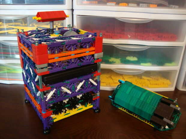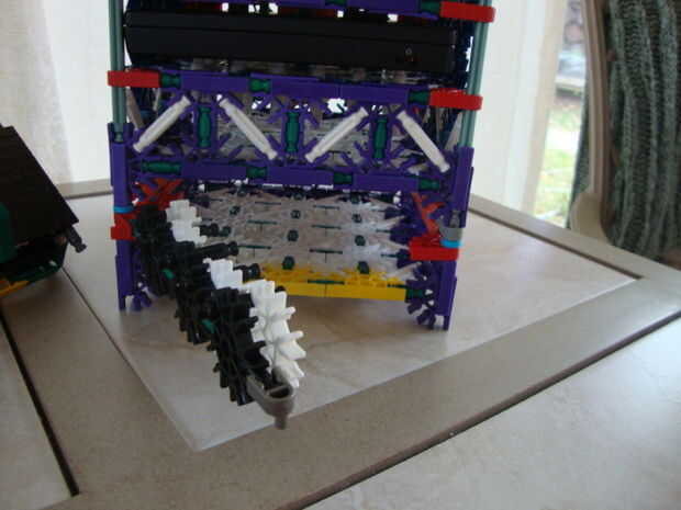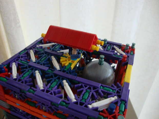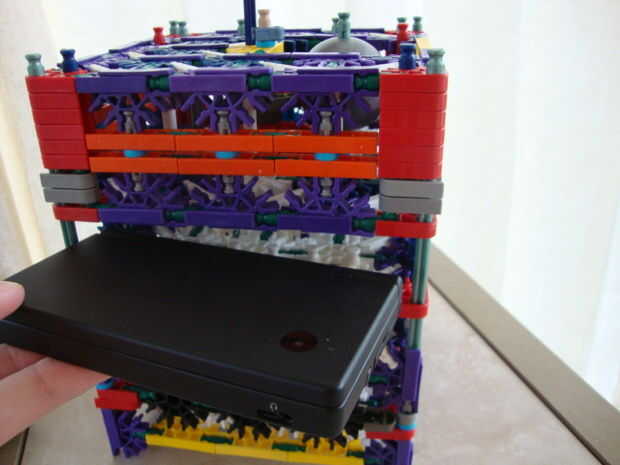 De todas formas este proyecto trabaja aprovechando el sol, usando el motor solar vendido por knex.com. Establece la unidad de recepción Solar o (SRU) en el alféizar de la ventana o donde el sol brilla primero en la mañana. Entonces cuando el sol alcanza el panel solar se enciende el motor. En el eje principal hay un clip gris que gira y golpea una pelota de plástico, que a su vez hace un molesto ruido para despertarle.