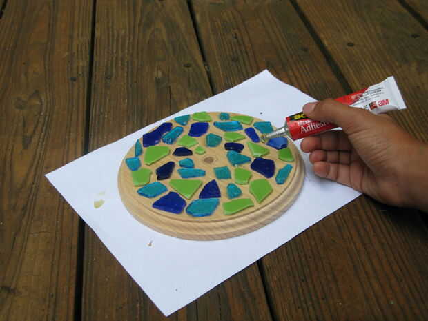 Toma el pegamento y pegar las teselas en lugar. No olvide pegar las baldosas demasiado cerca en el agujero del centro.