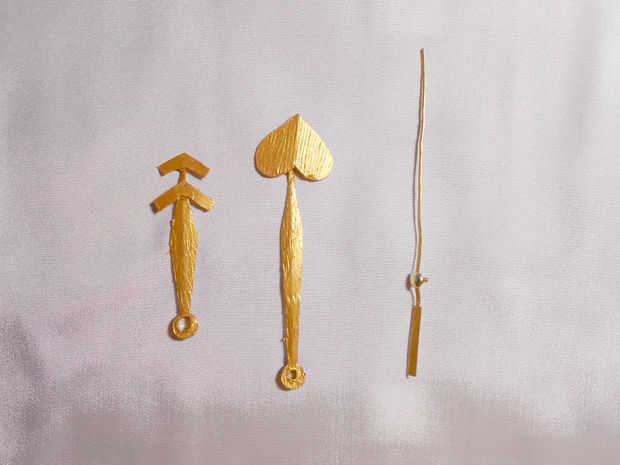 De las agujas del reloj, hizo un corazón y dos flechas con una caja de cereal y pegamento en las manos de reloj. Entonces, los pinté con pintura acrílica oro. Cubren de tres capas para hacerlos todos.