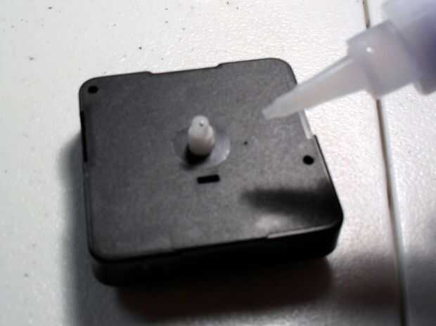 2) Coloque el mecanismo del reloj (quitado en el paso 4) a la parte posterior de su expediente colocando unas gotas de pegamento en la caja de engranajes y presionando contra el registro.