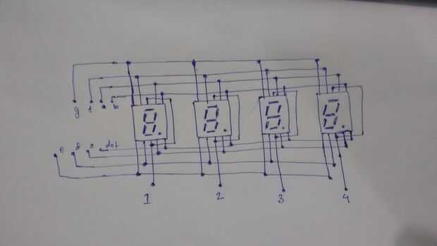 Recordarme todo a, b, c, d, e, f, g, segmentos de punto de 4 pantallas se conectan entre sí... y el com de cada pantalla es decir 3 y 8 están conectados junto con las resitors...