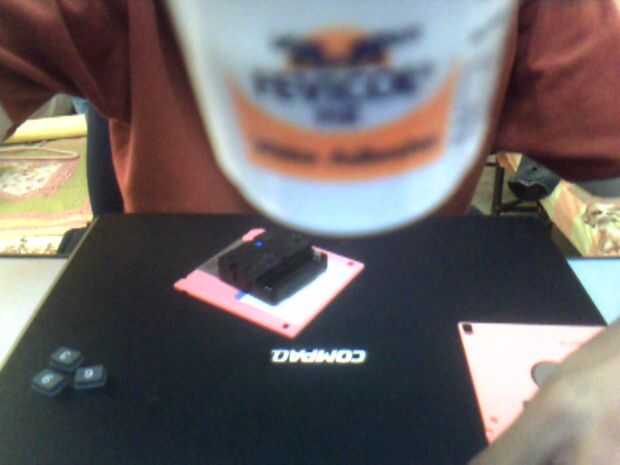 Ahora que tienes la posición correctamente, aplique un adhesivo en los bordes de reloj y presione fuertemente en el disquete. Asegúrese de que no dejar ningún espacio entre el disquete y el reloj. Mantenerlo así durante algún tiempo para que el reloj se pega correctamente en el disquete.