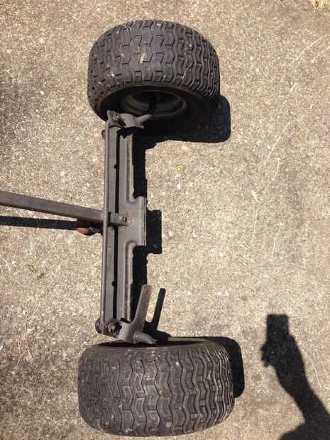 Corte el extremo del tubo en un ángulo de 45o. Soldó con autógena el tubo hacia el lado del eje así que estaba descansando en el enlace de la dirección. Luego enderezó las ruedas y había soldado el eje de dirección al tubo.