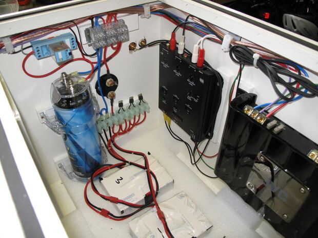 La misma tuerca audio coche tenía una muy grande (1.7F) condensador como este uno que dijo que él podría "prestarme". Al principio pensé que no lo necesito y porque es bastante pesado me iba a salir hacia fuera. Luego lo pensé y dado cuenta de que si podía suavizar los picos de corriente de la batería que deben durar mucho más (pérdidas internas en las células suben con el cuadrado de la corriente) por lo que decidí instalarlo. Está conectado a las baterías justo después el interruptor de aislamiento por un resistor 100R para que cuando usted encienda el aislante las cargas del condensador lentamente a través del resistor. Una vez que el condensador se carga tengo un segundo interruptor que conecta directamente a través de las baterías. No sé cuánto diferencia que como nunca he probado ejecutando el sistema con él desconectado pero mide la corriente de las células y ciertamente parece estar haciendo algo! Tiene también un voltímetro, por lo que se puede utilizar para controlar el voltaje de la batería pero al verlo que tienes que mirar en uno de los puertos bajo que no es muy conveniente (y no es muy bueno para los oídos).