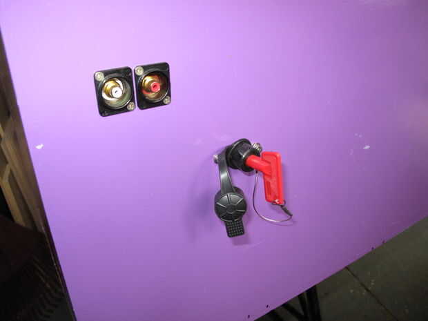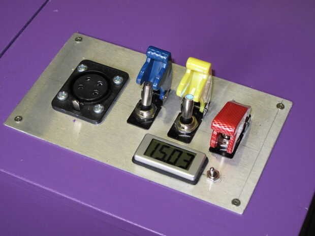 El pequeño interruptor enciende y apaga el voltímetro. Tiene que correr de 9V y por simplicidad solo montara una batería de 9V en el panel! El conector de 4 polos grandes es para la alimentación en el rango medio y agudos que pueden ser quitados para el transporte o almacenamiento. El conector es supuestamente impermeable pero no he puesto a prueba todavía. Ya veremos lo que sucede la primera vez que tengo el sistema hacia fuera en la lluvia!