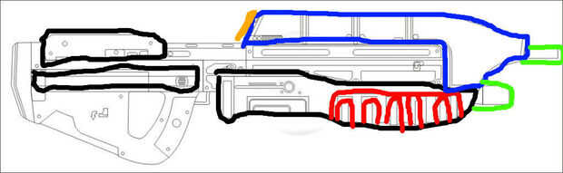 Ahora hacen los detalles como el cañón, linterna (no trabajo), unas otros detalles. lo esbozado en la fotografía es una sustancia que solo corte de espuma de artesanía y pegamento en la pistola. Nota: Las piezas de contorneada rojo, pegue encima de la pieza por debajo de él para hacer la empuñadura. Lo azul se hace poniendo una pieza vertical recto por el lado de la pistola y luego hacer otra pieza y poner diagonalmente desde la parte superior de la pieza vertical en el borde de la pistola. Para el verde, sólo enrollar espuma de artesanía hasta llegar al ancho deseado. Para la naranja, sólo imprimir la imagen del contador de munición y pegamento caliente hacia donde iría el contador. Para el gatillo, solo cortar un trozo de espuma de EVA la forma del gatillo y encolarla.