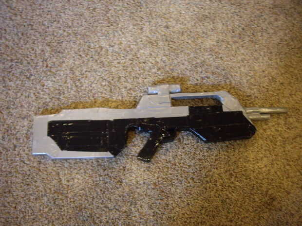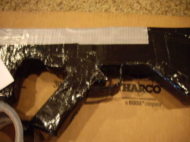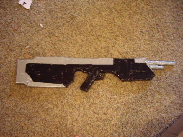 Ahora hace el carril, alcance, barril y el gatillo y colorearlos. Para el ferrocarril, hacer lo mismo que hiciste con la pistola pero los lados son la forma de carril. Este color con la cinta de color gris plateado. En el extremo que se enfrentarán a usted (el tallo), poner un rectángulo pequeño de teal conducto de cinta para el contador de munición y escribe cualquier # que desea que por la cantidad de munición "en" la pistola. Para el ámbito de aplicación, utilice el tubo de papel higiénico, cortar una línea recta por la mitad del tubo en solamente un lado por lo que se puede rodar para arriba así que la circunferencia es más pequeña. Hacer que el diámetro de 1"- 1.5" para el tubo. Para conectar a la pistola, envolver una pequeña franja de color gris plateado de cartón 3/4 de la manera alrededor así que tiene forma de U. Cinta en el ámbito de aplicación por lo que los 2 "dientes" en la parte inferior de la mira. Si se hace correctamente, estas "puntas" recortará ferrocarril. Este color también con la cinta adhesiva de color gris plateado. En cada extremo del alcance, círculos de cartón de cinta en y cubrir cada extremo con cinta pato. Uno de estos lados, poner un + vista en forma o cualquier forma te quiere. Para el cañón, lo mismo que el alcance sólo con un tubo de toalla de papel y en un extremo tiene una hendidura en el extremo. Conecte uno de estos abajo y debe ser más corto. Color dos de ellas con la cinta adhesiva de color gris plateado. Para el gatillo, hacen una forma de gatillo usando la técnica utilizada en el paso 2. Este color negro. Hacer el gatillo protector con una tira de color negro de cartón.
