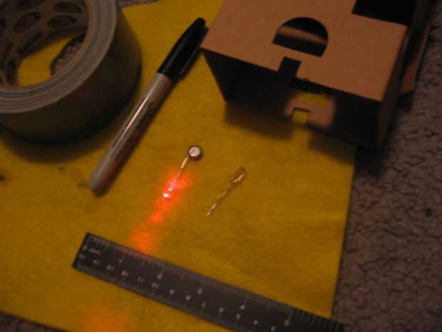 Cinta, tijeras, dos luces LED rojo brillantes, Cartón, por supuesto. O algo diferente, como Junta de cartel. papel de aluminio, y un rollo de cinta de conducto vacío.