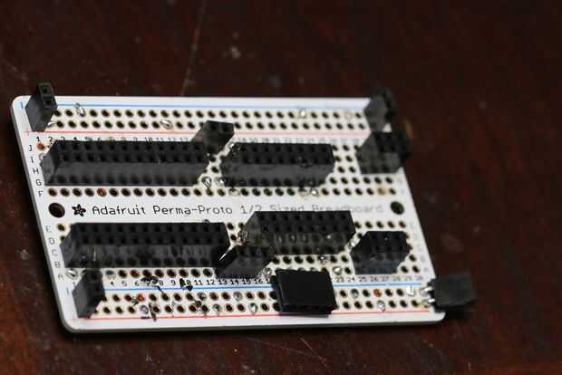 Cuando estás comenzando la construcción de la placa base, que desea diseñar tal que organizan los headers hembra la distancia adecuada unos de otros. Experimento antes de soldar completamente. Epílogo, el plan de su arreglo. PLAN, PLAN, PLAN! Entonces que usted puede soldar. La foto de arriba muestra la disposición general de las principales cabeceras femenino. Esta no es la manera sólo a organizar, pero al construir esto, esto encontramos el más conveniente.