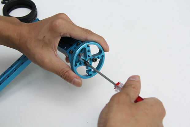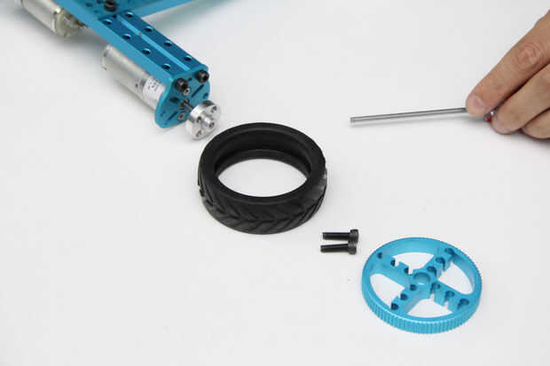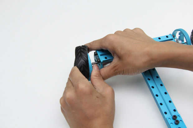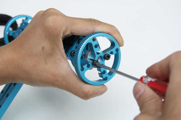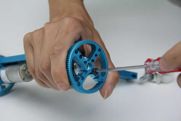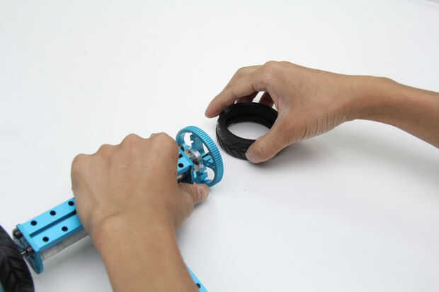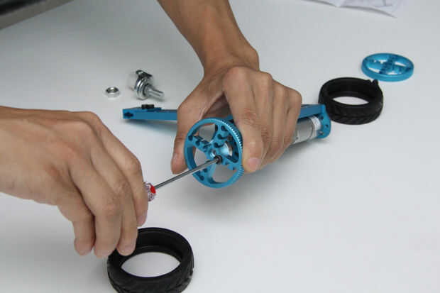 Fije las ruedas motrices. El volante es hecho por dos partes, la polea de sincronismo 90T y el neumático 68.5 × 22 mm.