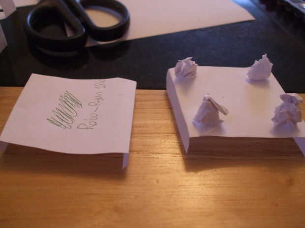Cortar 2 trozos cuadrados de papel, doblar los lados un poco, al hilo de 4 bits de papel, em scroo y pegar uno de los lados
