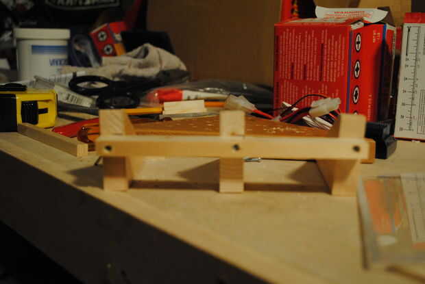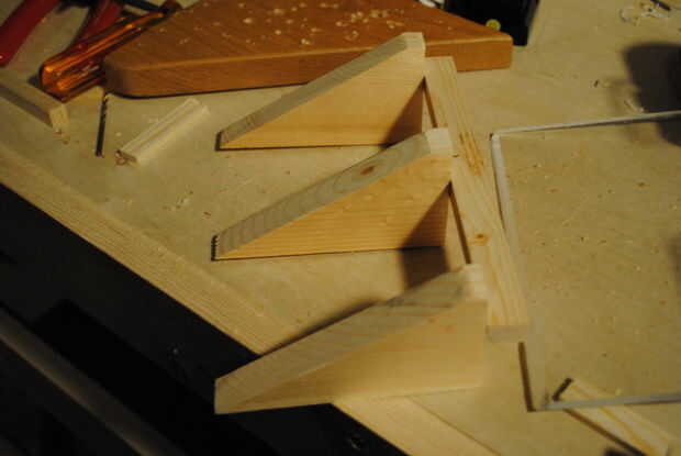 Colocar los triángulos en la base y deslice la nueva tira de pino debajo de los dos trozos cuadrados de plexiglás.