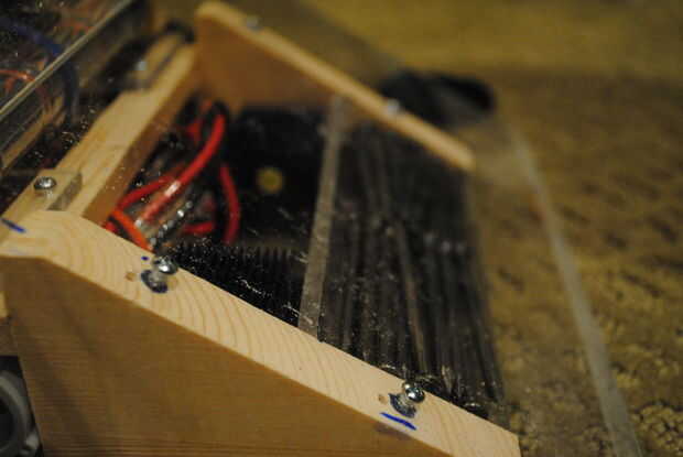 Asegure el plexiglás sobre con cuatro tornillos, asegurándose de que los clavos y la pequeña hoja de plexiglás se contienen dentro del robot.