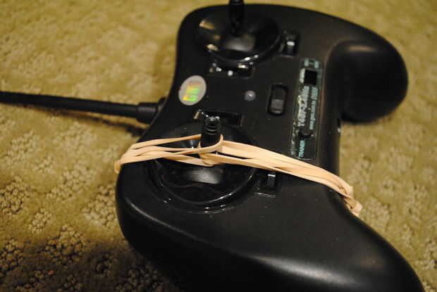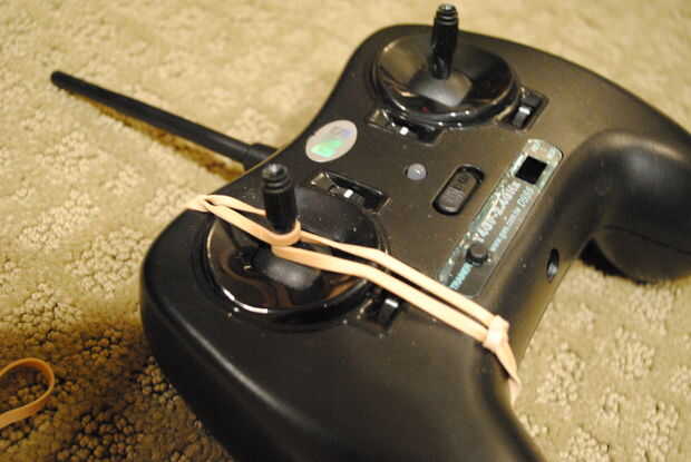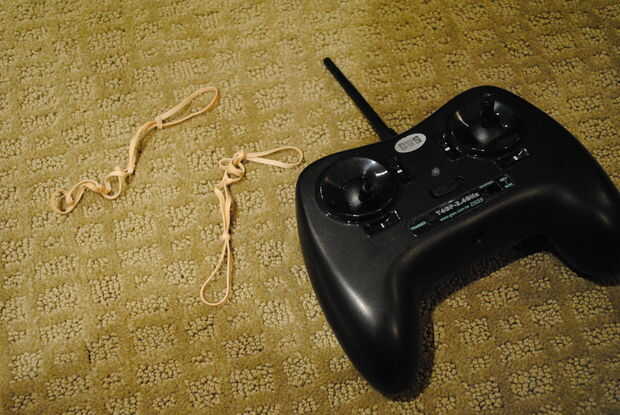 Puesto que el controlador es un avión uno, el joystick izquierdo "pega" o se queda en un solo lugar, ya que normalmente es un acelerador. Sin embargo, esto no es necesario para un robot de Sumo y es realmente difícil de usar, porque las tensiones son distintas. Para contrarrestar esto, atados a dos conjuntos de tres gomas y me coloca cada set de tres sobre la palanca de mando.