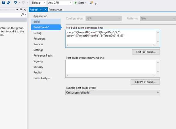 Utiliza el comando xcopy para copiar tanto de nuestro Diccionario (aiml y config) en la carpeta build y la etiqueta /D sólo copiará los archivos si se han actualizado desde la fuente (la carpeta del proyecto).