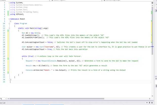 Bot AI = new Bot(); // This defines the object "AI" To hold the bot's infomation AI.loadSettings(); // This loads the settings from the config folder AI.loadAIMLFromFiles(); // This loads the AIML files from the aiml folder AI.isAcceptingUserInput = false; // This swithes off the bot to stop the user entering input while the bot is loading User myUser = new User("Username", AI); // This creates a new User called "Username", using the object "AI"'s information. AI.isAcceptingUserInput = true; // This swithces the user input back on while (true) { // This starts a loop forever so the bot will keep replying and accepting input Request r = new Request(Console.ReadLine(), myUser, AI); // This generates a request using the Console's ReadLine function to get text from the console, the user and the AI object's. Result res = AI.Chat(r); // This sends the request off to the object AI to get a reply back based of the AIML file's. Console.WriteLine("Robot: " + res.Output); // This display's the output in the console by retrieving a string from res.Output } // This is the end of the loop which would repeat back to the "While (true)" part Las piezas están en el cuadro anterior que en la sección de "static void Main (string [] args)"