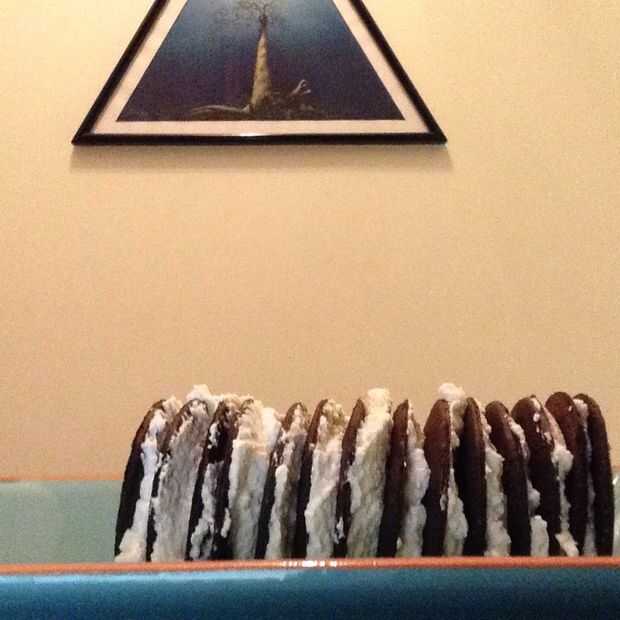 Tomar una galleta y extendió la crema batida, luego tomar otra galleta y pegan los dos.